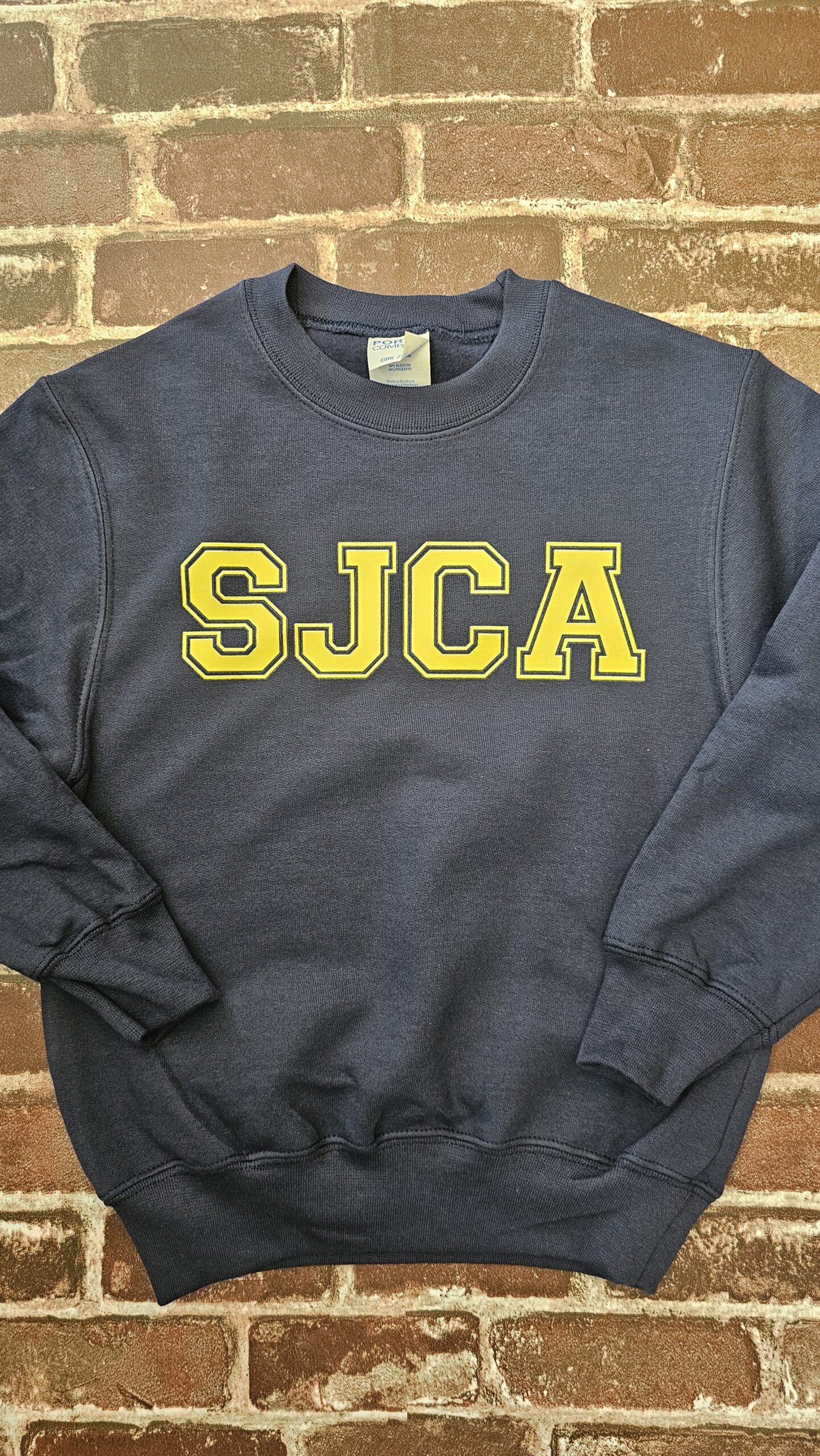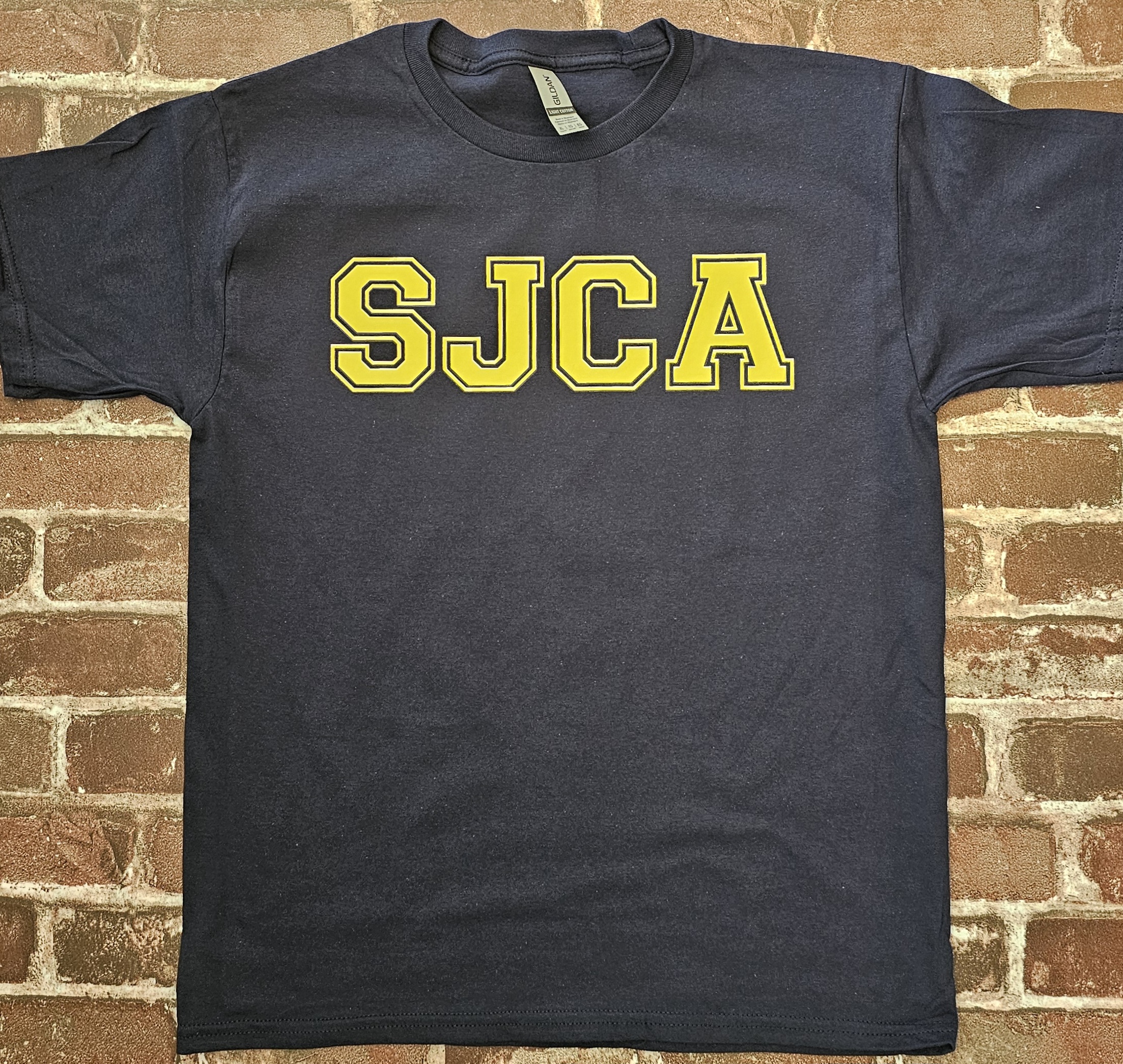 This design comes on a navy 100% cotton short sleeve tee or navy sweatshirt with SJCA in yellow.