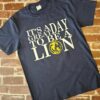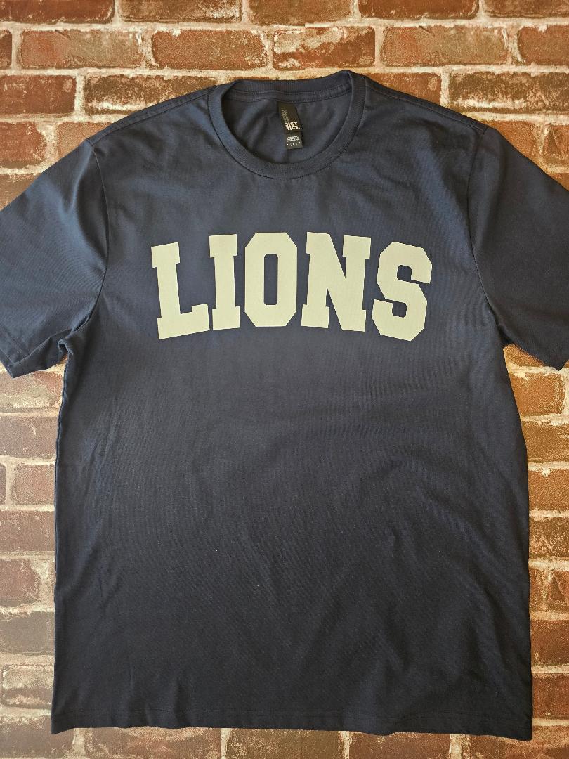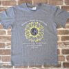Available on a navy, grey, yellow, or white t-shirt. White print on navy and grey. Navy print on yellow and white.