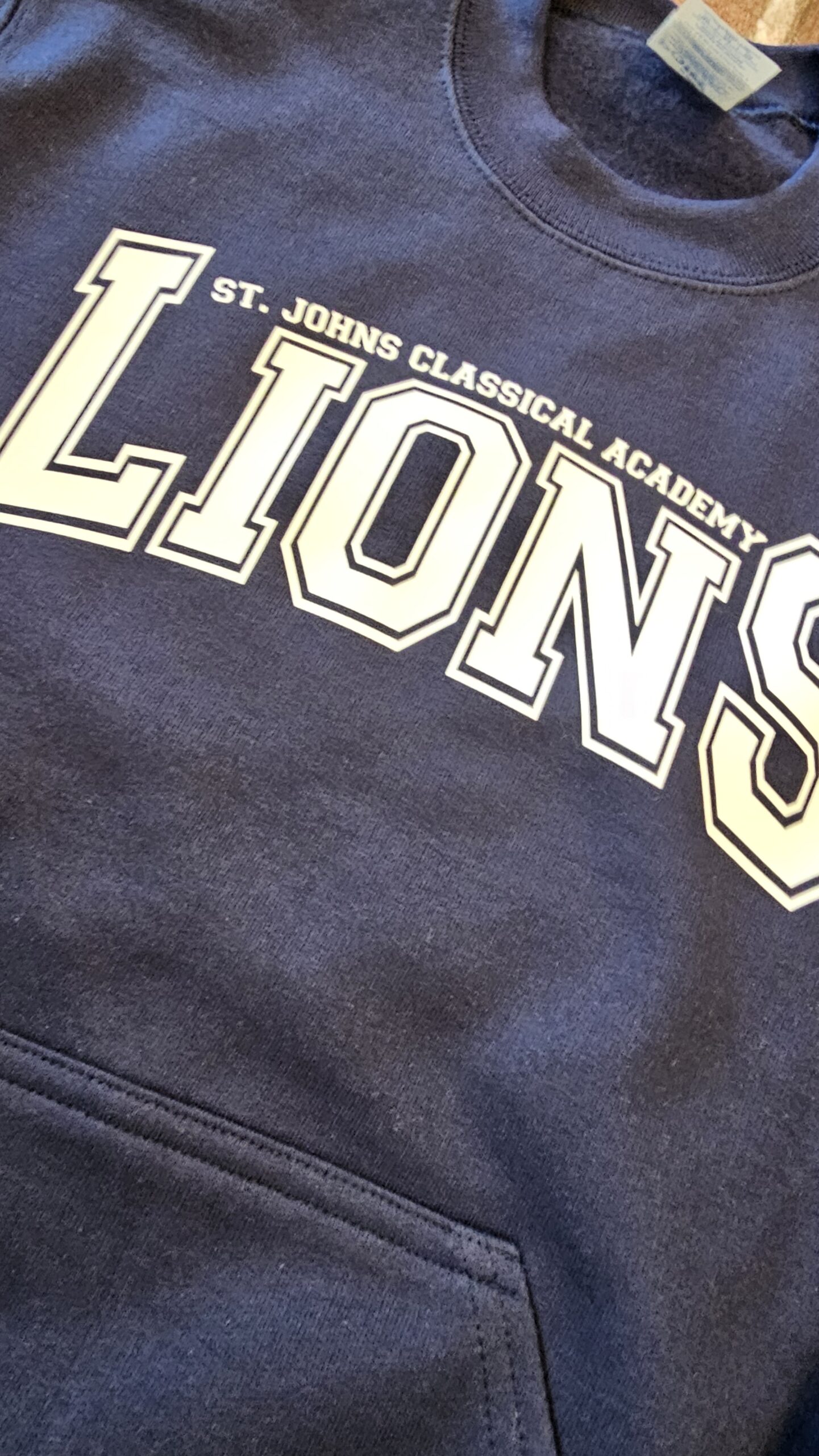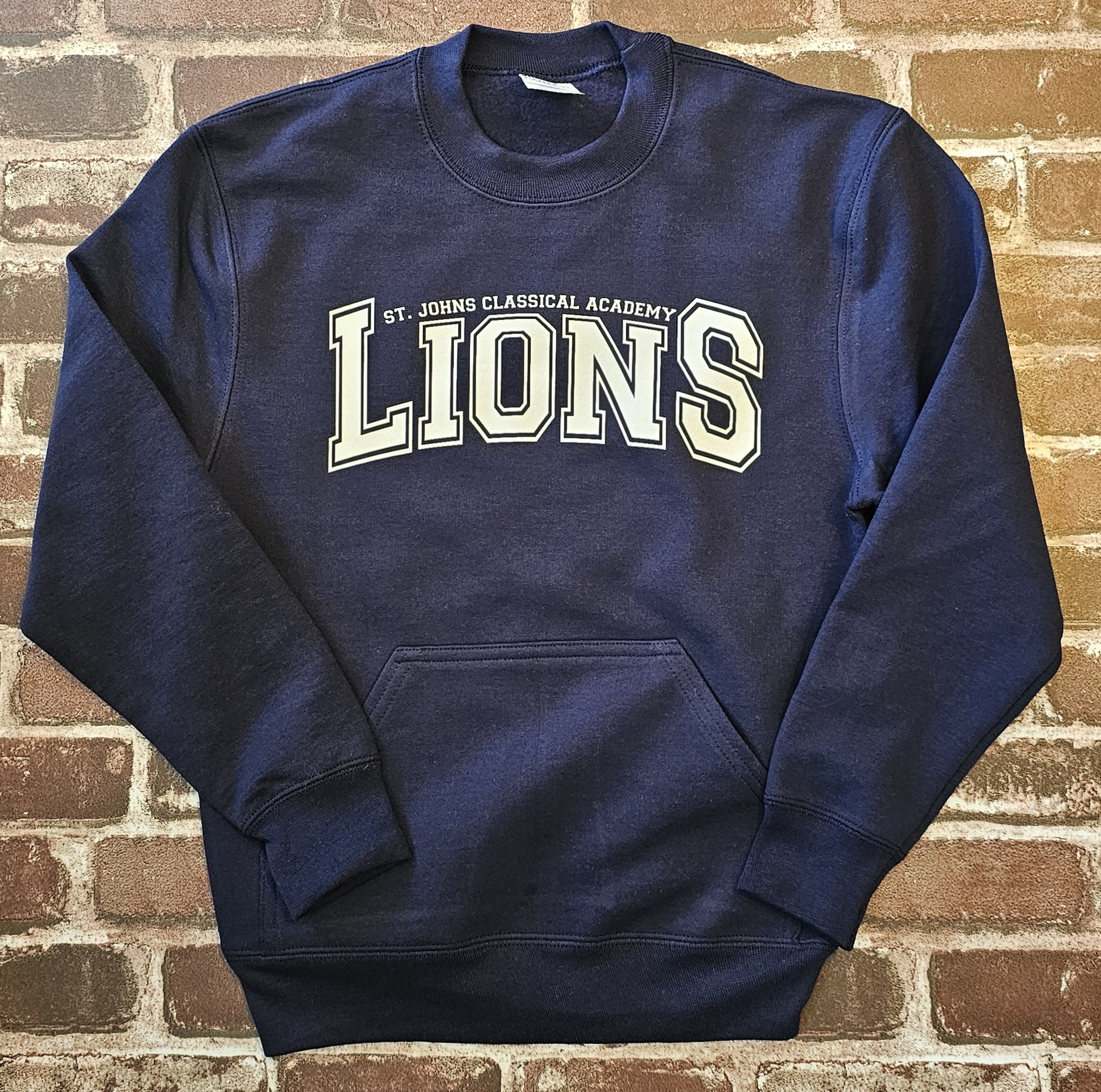 Navy crewneck sweatshirt with pocket and white script.