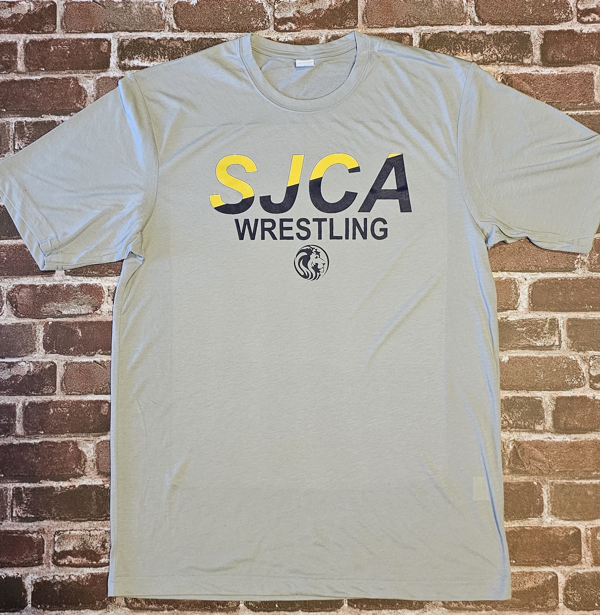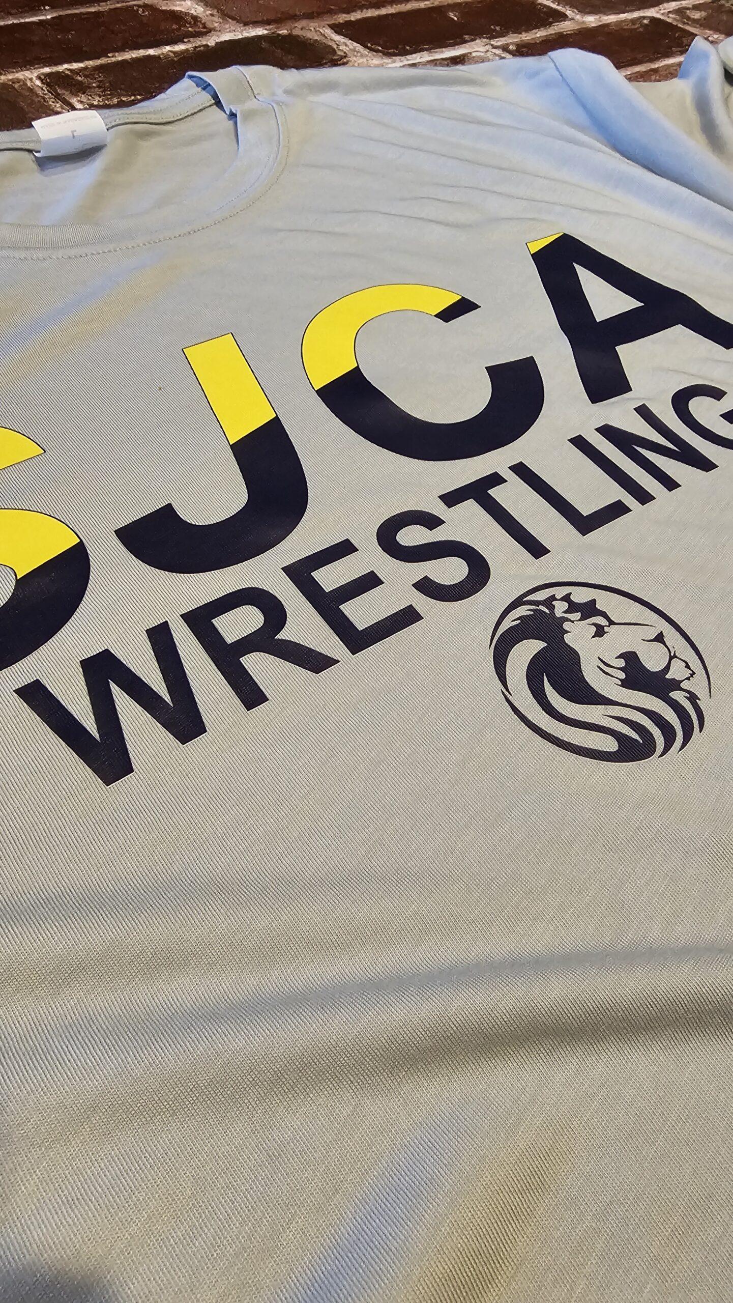 These shirts are the cotton feel 100% poly moisture wicking silver grey color that we use for the PE shirts.