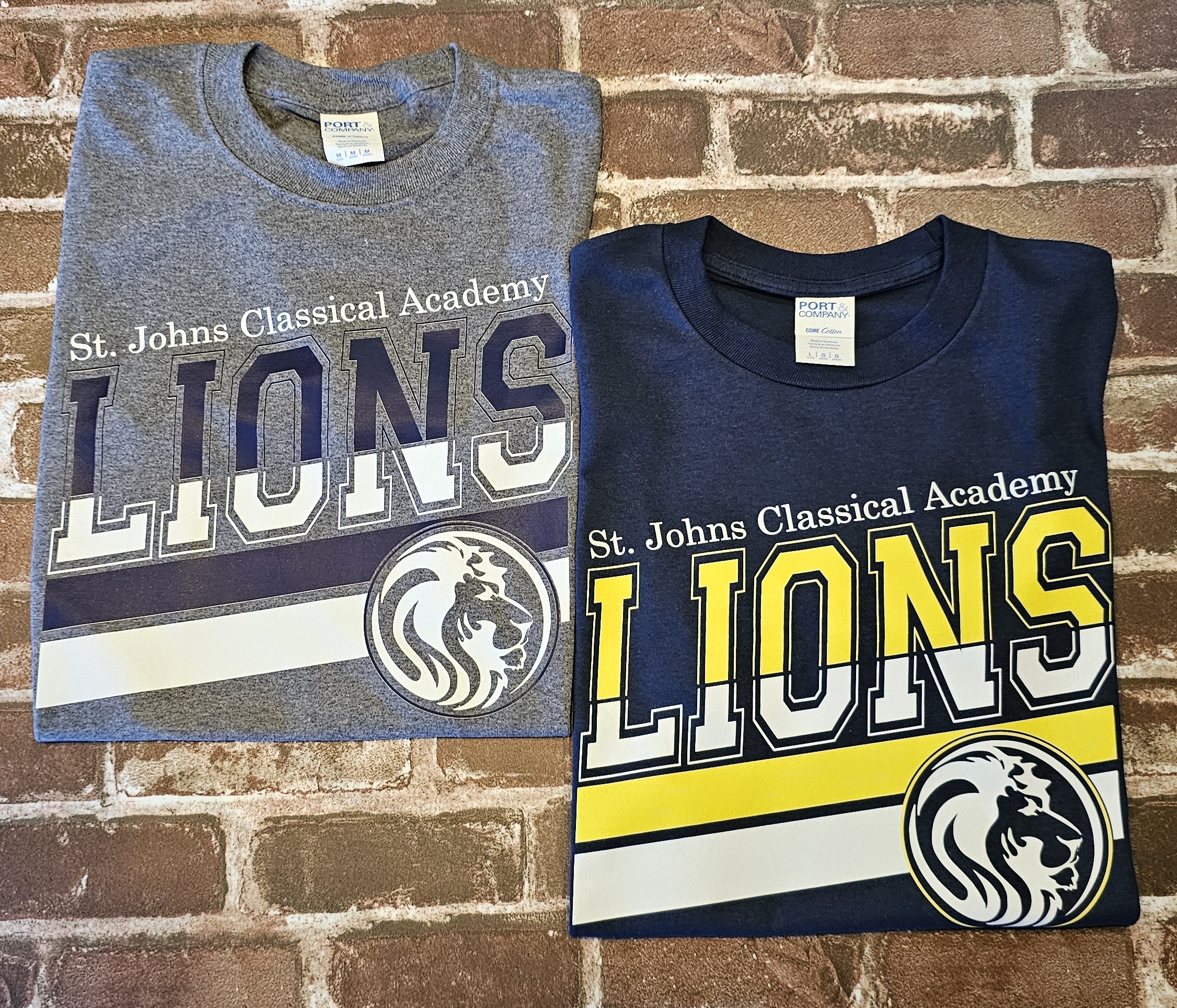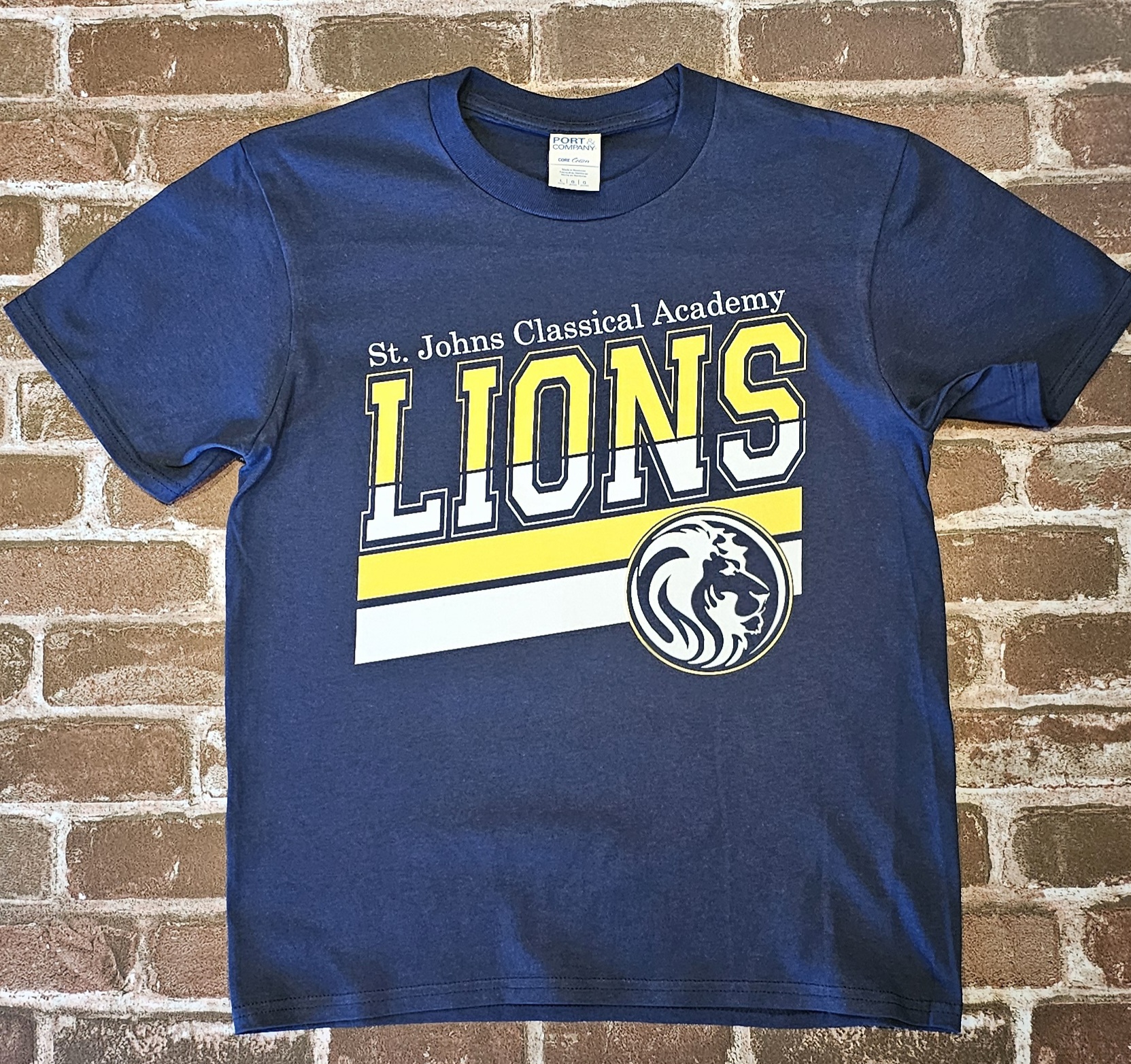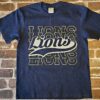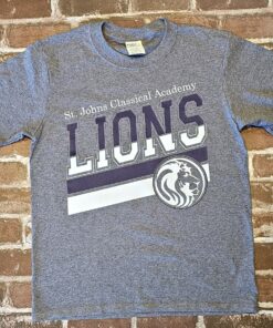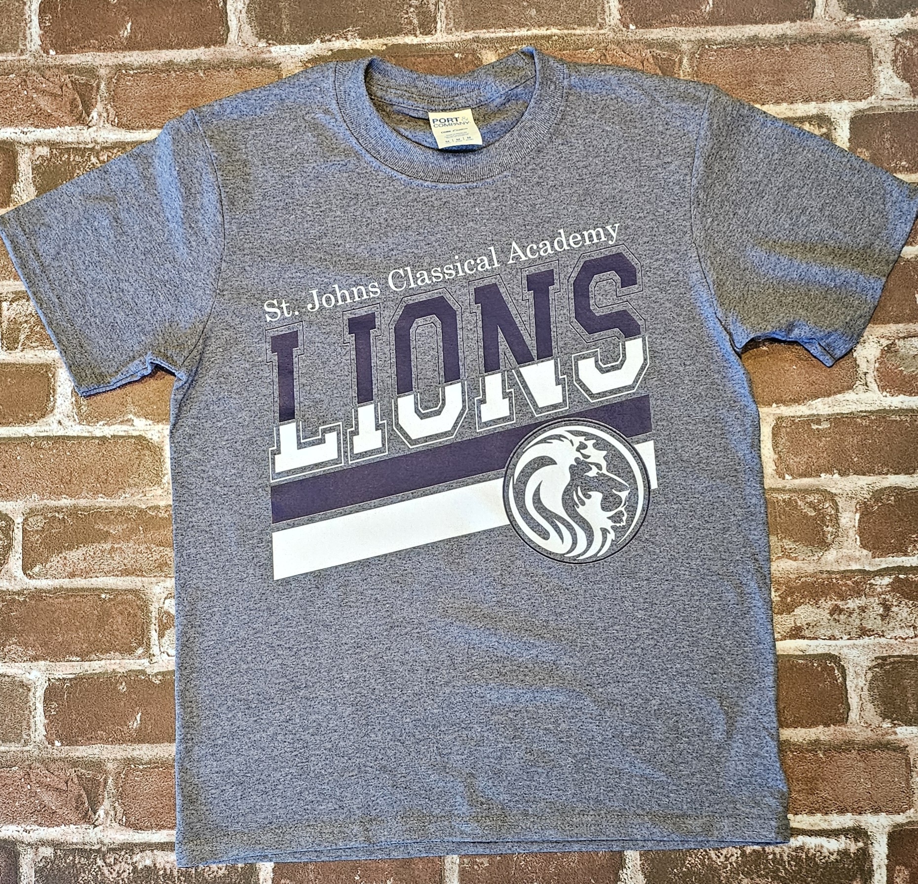 Go Lions! This spirit shirt comes in navy or heathered gray, 100% cotton, pre-shrunk tees.